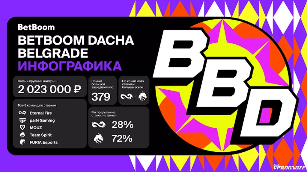Вторая BetBoom Dacha Belgrade прошла с 24 августа по 1 сентбяря в Сербии. Чемпионом ивента стала Team Spirit, в финале клуб обыграл Eternal Fire — 3:0. Точный счет угадали 30,5% пользователей BetBoom.