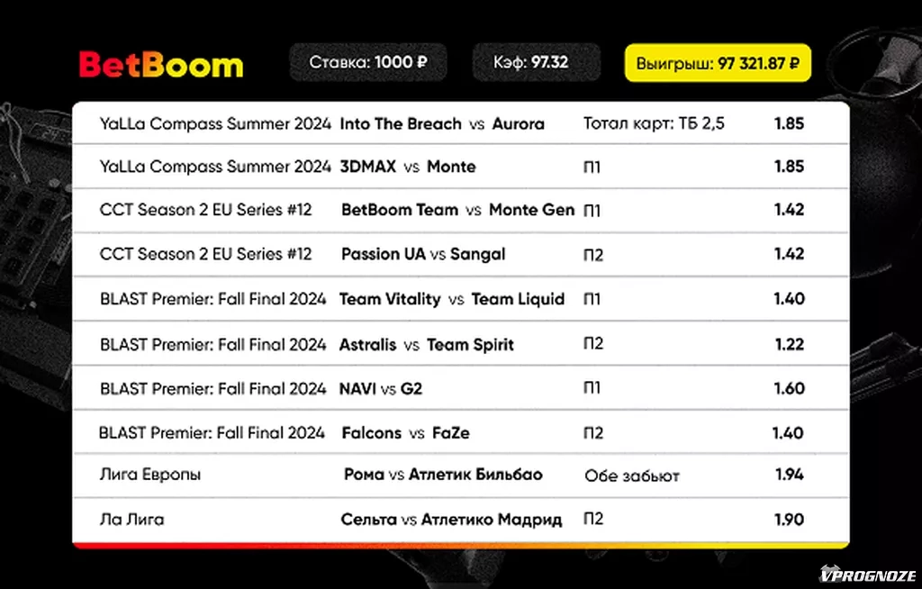 Практически во всех матчах пользователь BetBoom ставил на победу фаворитов. Исключением стала ставка “обе забьют” на Лигу Европы и две ставки в рамках YaLLa Compass Summer 2024: в матче 3DMAX — Monte однозначного фаворита по котировкам не было, а во встрече Into the Breach — Aurora беттор поставил на тотал карт.
