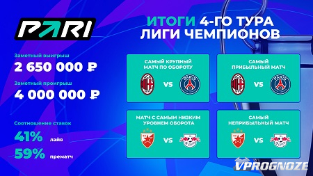 Крупнейший чистый выигрыш на 4-м туре Лиги чемпионов составил 2 342 000 рублей. Один из клиентов PARI поставил 100 000 рублей, собрав экспресс из восьми матчей. Он выбирал ставки на тоталы и двойные исходы с коэффициентами от 1.13 до 1.80. Большая часть ставок была сделана в прематче и приходилась на первые таймы, однако в двух матчах игрок ставил в лайве. Суммарный коэффициент купона составил 23.42. Большая часть ставок доехала без особых сложностей, однако матч «Манчестер Юнайтед» с «Копенгагеном» заставил понервничать. В этой игре клиент поставил на то, что «красные дьяволы» не проиграют в первом тайме. В итоге к моменту начала перерыва соперники успели обменяться двумя голами, при этом датчане сравняли счет прямо перед уходом в раздевалку.