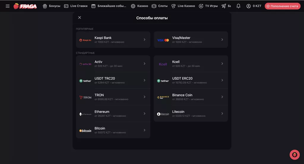 Регистрация на сайте fragabet.com и ввод персональных данных — обязательное условие для начала игры в БК. Пользователю доступна установка языковой версии: казахстанская, русская, турецкая, азербайджанская, английская.