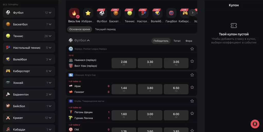 Максимальное количество вариантов для пари букмекер предлагает поклонникам футбола, хоккея, баскетбола, тенниса и киберспорта. В разделах доступен выбор международных и локальных соревнований и маркетов, в том числе на статистику и индивидуальные достижения спортсменов.