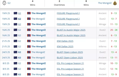 G2 на сегодняшний день занимают 8 строчку в рейтинге от портала HLTV. The MongolZ на сегодняшний день идут на 1 месте в Монголии и занимают 5 строчку в рейтинге от HLTV.