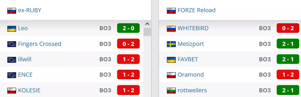 FORZE Reload на данный момент идут на 15 месте в России, а в мировом топе команда занимает 102 строчку. ex-RUBY на сегодняшний день идут на 12 строчке в России и занимают 80 позицию в рейтинге от портала HLTV.