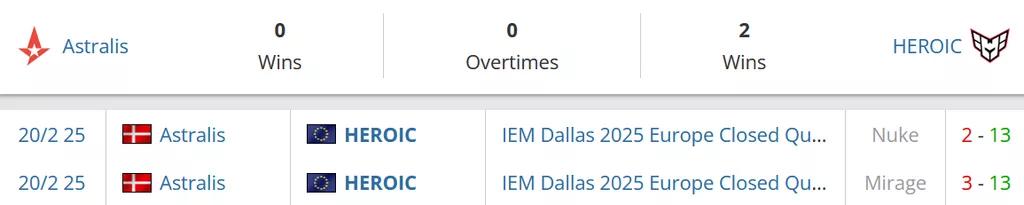 В этом году команды встречались лишь однажды - на квалификациях на IEM Dallas, тогда HEROIC уничтожила датчан со счётом 26:5 по итогам двух карт.