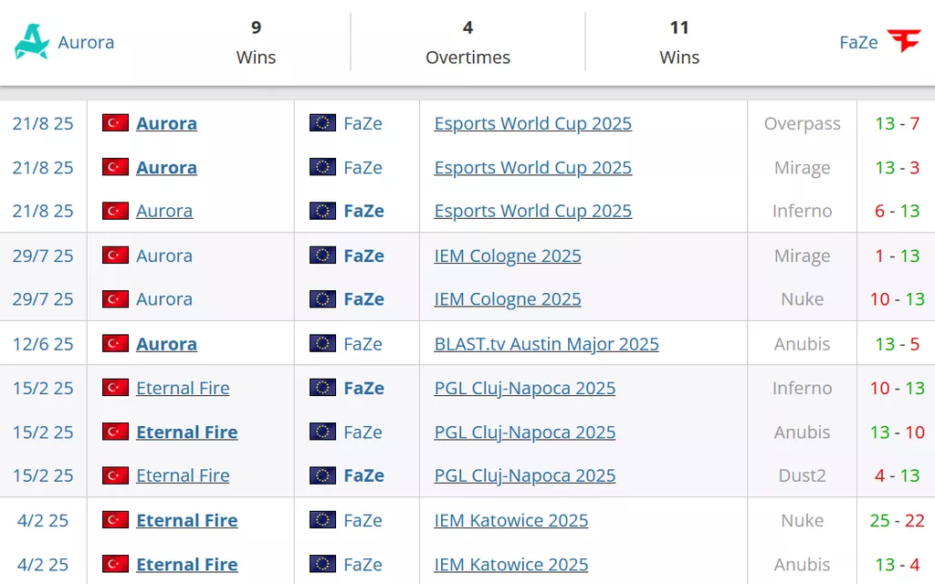Пять раз встречались эти коллективы между собой в этом году. Счет 3-2 в пользу Aurora. Общий счет по картам за все время 11-9 в пользу FaZe. Последний раз команды играли между собой в конце августа, тогда со счетом 2-1 победили Aurora.