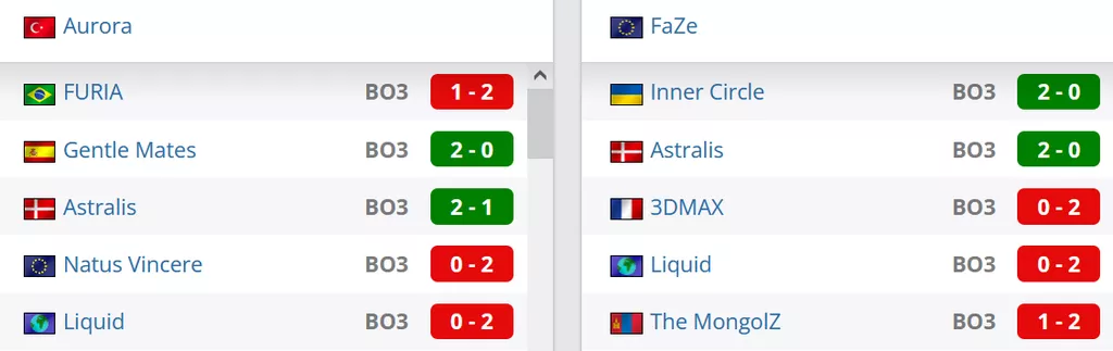 Aurora на сегодняшний день лучшая команда Турции. В рейтинге от портала HLTV коллектив занимает 8 строчку. FaZe уже седьмой год не вылетают из двадцатки лучших и идут на 14 строчке в мировом топе.