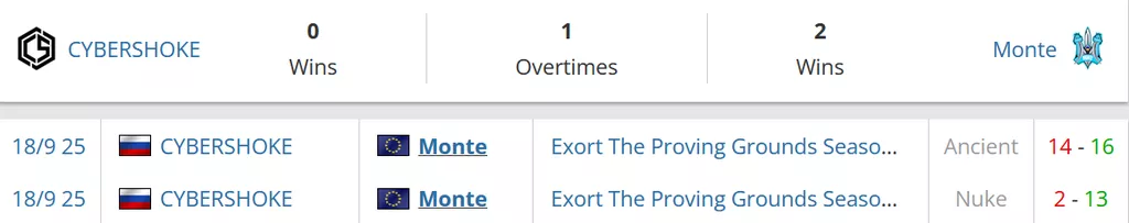 Коллектив не так давно испытывал большие проблемы. Он проиграл встречи против SINNERS, ESC, Oramond, Betera. При этом, ранее он выиграл поединки с FB Team, BetBoom, 1win, Y5, AMKAL. Все же, CYBERSHOKE начинают преодолевать кризис и предыдущие матчи провел достойно – одолел RUBY и Nemiga. Навязать борьбу Monte коллектив явно способен.