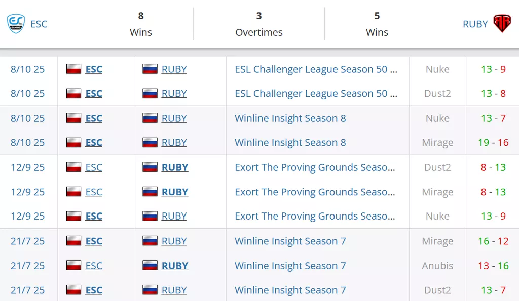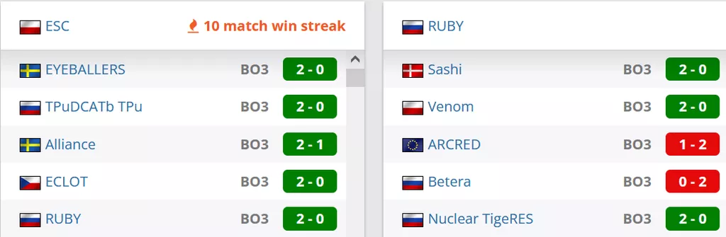 ESC на данный момент занимают 1 позицию в Польше и идут на 39 месте в рейтинге от портала HLTV. RUBY на сегодняшний день идут на 11 месте в России и занимают 77 строчку в рейтинге от портала HLTV.
