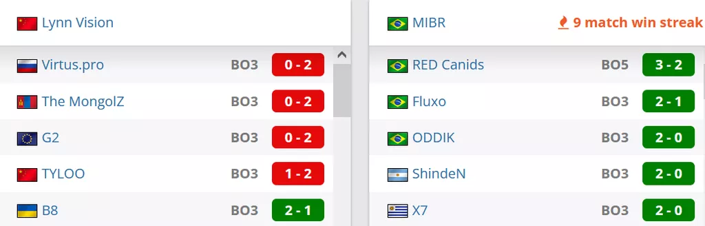 Lynn Vision на данный момент занимают 2 строчку в Китае и идут на 27 позиции в рейтинге от портала HLTV. . MIBR на данный момент занимают 4 строчку в Бразилии и идут на 35 месте в рейтинге от портала HLTV.