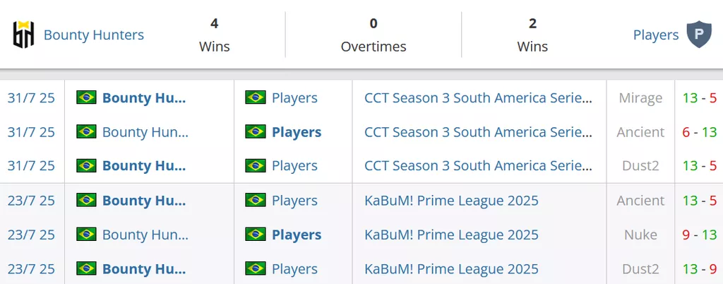 Bounty Hunters на сегодняшний день занимают 17 место в Бразилии и идут на 137 строчке мирового топа. Players на сегодняшний день рейтинга от портала HLTV не имеют.