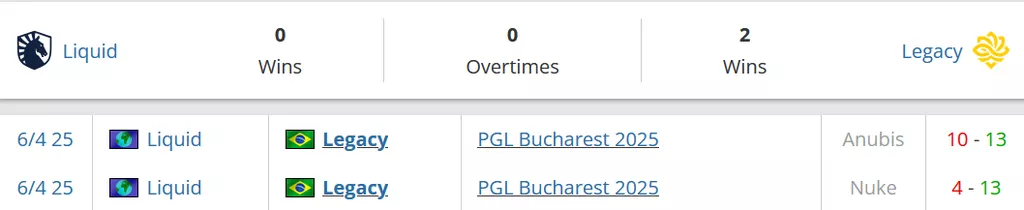 Один раз встречались эти коллективы между собой в начале апреля этого года. Тогда на двух картах победили Legacy. Забрали парни свой выбор de_nuke со счетом 13-4 и были сильнее на пике соперника de_anubis со счетом 13-10.