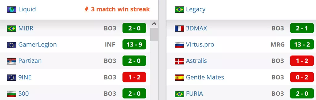 Legacy на сегодняшний день занимают 3 строчку в Бразилии и 25 позицию в рейтинге от портала HLTV. Liquid на сегодняшний день занимают 13 строчку рейтинга от портала HLTV.