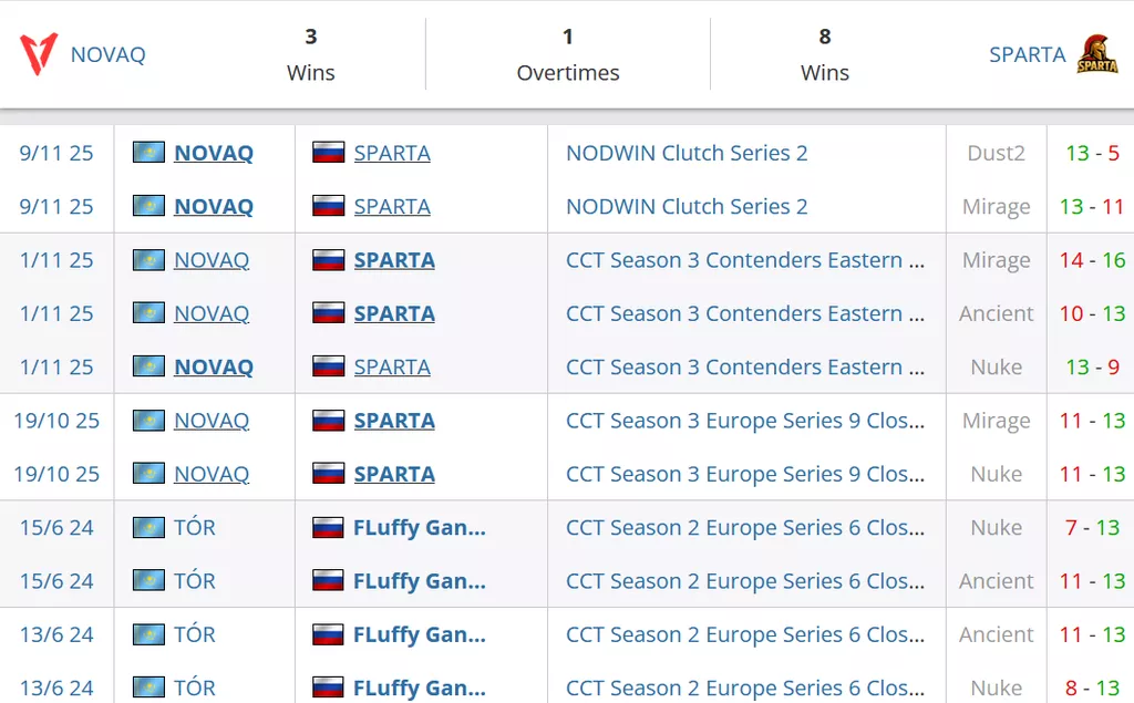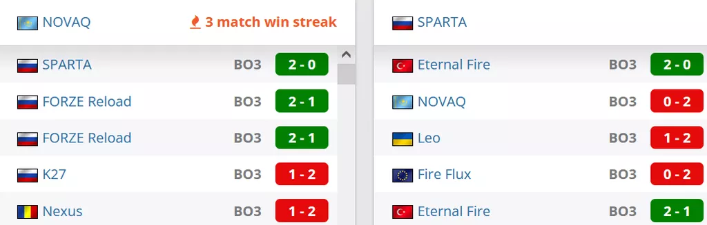 NOVAQ на данный момент лучшая команда Казахстана. В рейтинге от портала HLTV коллектив идет на 99 строчке. SPARTA на сегодняшний день занимают 16 строчку в России и идут на 85 позиции в рейтинга от портала HLTV.