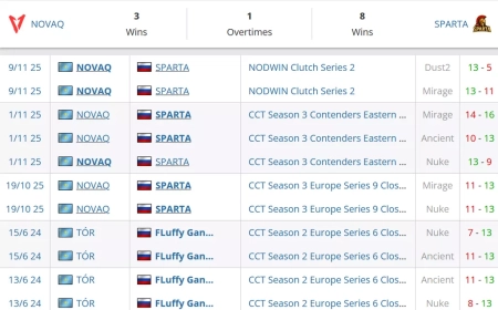 Пять раз играли эти коллективы между собой за последние два года. Счет 4-1 в пользу SPARTA. Общий счет по картам 8-3 в пользу россиян. Последний раз команды играли между собой вчера, тогда на двух картах победили NOVAQ.