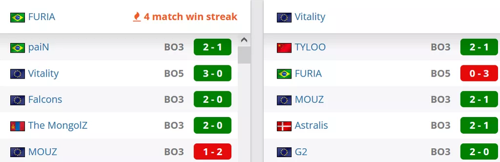 FURIA на сегодняшний день идет на 1 месте в Бразилии и на 2 позиции в рейтинге от портала HLTV. Vitality на сегодняшний день занимают 1 место в рейтинге от портала HLTV.