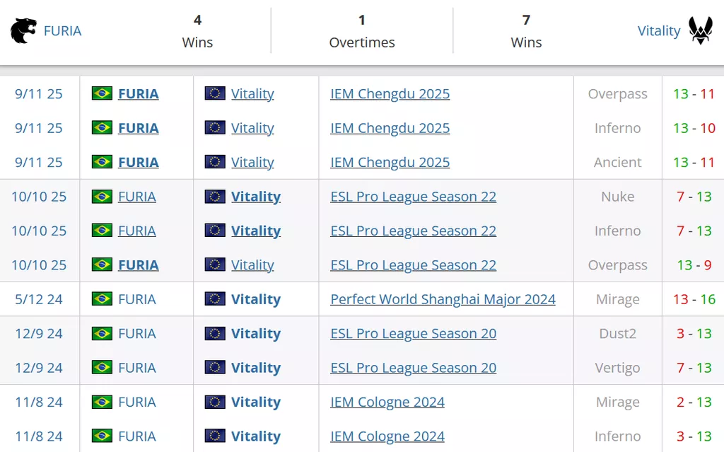 За последние два года FURIA и Vitality сыграли 5 матчей, где перевес на стороне Vitality — 4 победы против 1 у бразильцев. Однако единственная победа FURIA была совсем недавно, и какая — 3:0 в финале IEM Chengdu. До этого Vitality уверенно контролировали серию (2:1, 1:0, 2:0, 2:0), но сейчас ситуация поменялась: FURIA нашли свой ритм и умеют адаптироваться к европейскому стилю Vitality.