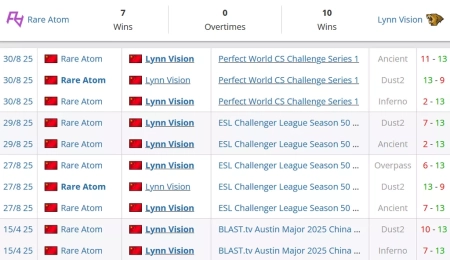 Rare Atom на сегодняшний день идут на 4 месте в Китае и занимают 95 строчку в мире. Lynn Vision на данный момент занимают 2 строчку в Китае и идут на 23 позиции в рейтинге от портала HLTV.