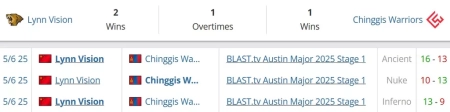Команды пересекались на BLAST Austin Major 2025 Stage 1 и провели сразу три карты в одном матче. Тогда Lynn Vision взяли две из них 16-13 на Ancient и 13-9 на Inferno, а Warriors выиграли Nuke со счётом 13-10. Всё прошло в равной борьбе, но преимущество осталось за Lynn Vision. Показательно, что Chinggis Warriors даже в проигранных картах держались близко и не разваливались, что говорит о неплохом матчапе против LV.