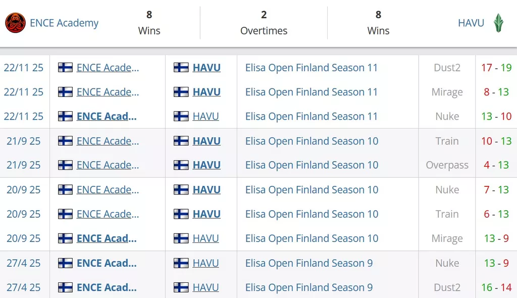ENCE Academy на данный момент занимают 1 строчку в Финляндии и идут на 145 месте в мировом топе. HAVU на сегодняшний в рейтинге от портала HLTV идут на 155 позиции и занимают 2 место в Финляндии.