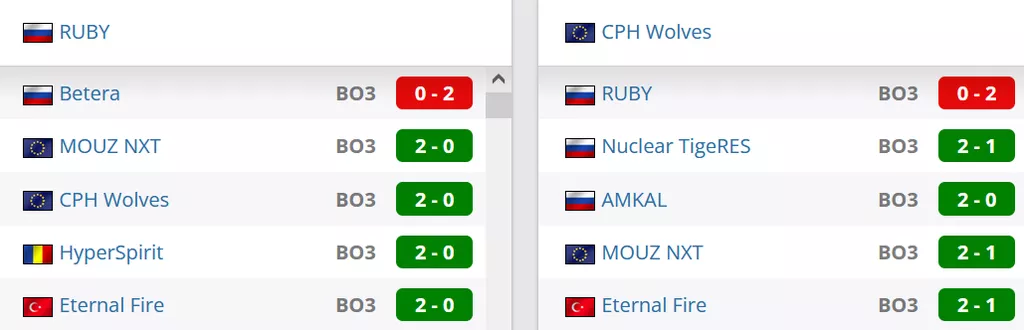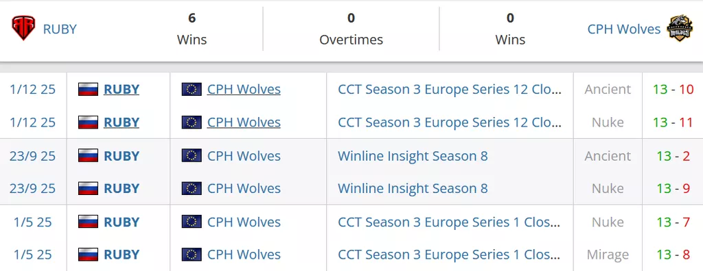 CPH Wolves на данный момент занимают 99 позицию в рейтинге от портала HLTV. RUBY на сегодняшний день идут на 15 месте в России и занимают 69 строчку в рейтинге от портала HLTV.