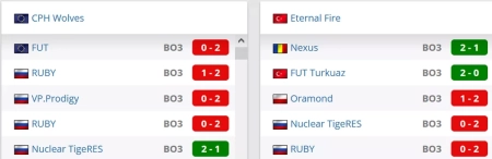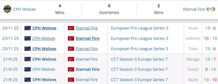 Волки немного сдали на текущем отрезке сезона. Они потерпели поражения от FUT и даже VP.Prodigy, а также дважды уступили RUBY. Тем не менее, до этого коллектив показывал очень хорошие результаты. Так, он обыграл Nuclear TigeRES, AMKAL, MOUZ NXT, Novaq и как раз одолел Eternal Fire со счетом 2:1. CPH Wolves и в этой встрече способны повторить успех.