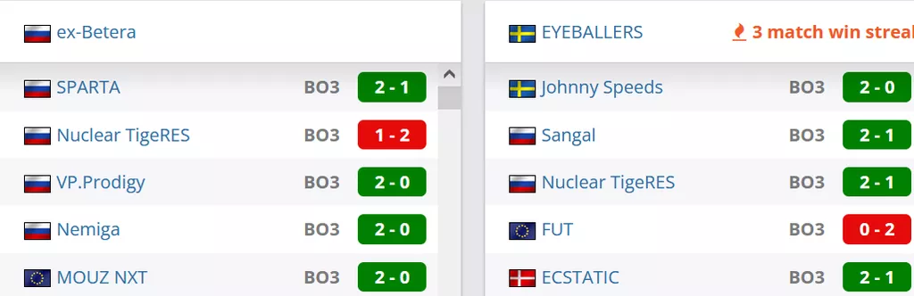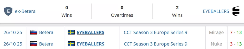 EYEBALLERS на сегодняшний день идут на 1 позиции в Швеции и на 33 строчке в рейтинге от портала HLTV. ex-Betera на сегодняшний день идут на 15 строчке в России и занимают 78 позицию в рейтинге от портала HLTV.
