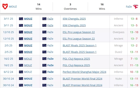 Вообще история у коллективов очень богатая. В итоге 16 карт осталось за Фэйзами за последнее время. 14 раз смогли выиграть у своего соперника Мышки. Но в 2025 году пока что преимущество на сторону MOUZ. Коллектив проиграл в 1-ой встрече со счетом 2:0, но дальше выиграл 3 матча кряду. Выиграл все 6 карт у соперника.