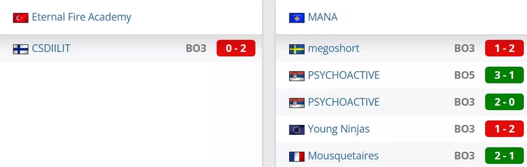 Первый раунд нижней сетки. Бо3 формат. Встречаются команда из Турции Eternal Fire Academy и коллектив из Косово MANA. Победитель этого матча сыграет в полуфинале нижней сетки против слабейшего из пары Prestige/Preasy Mix, а проигравший коллектив покидает этот чемпионат.