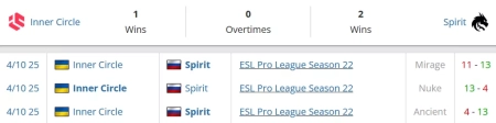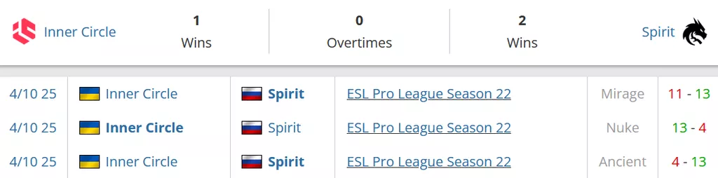 История очных встреч показывает, что Spirit выиграли у Inner Circle ранее, но вовсе не в абсолютном доминирующем стиле — карты завершались с разницей, где выигрывавшая команда всё равно теряла существенное количество раундов (например, 13:11 на Mirage). Это говорит о том, что карты против Spirit не всегда бывают быстрыми и чистыми, особенно когда соперник умеет навязывать определённое сопротивление.