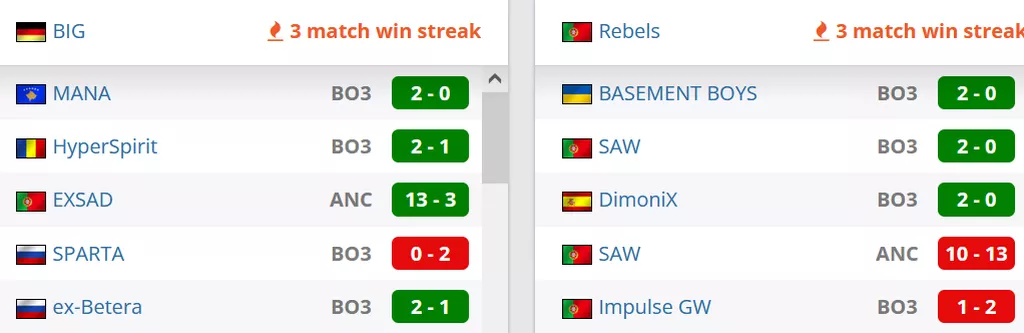 Rebels на сегодняшний день 7 команда Португалии. В рейтинге от портала HLTV коллектив занимает 142 строчку. BIG на сегодняшний день лучшая команда Германии. В рейтинге портала HLTV коллектив занимает 95 место.