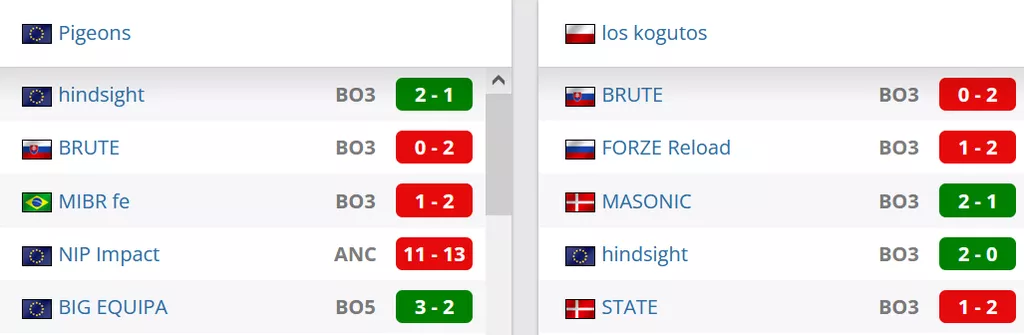 Pigeons на данный момент занимают 201 позицию в рейтинге от портала HLTV. los kogutos на данный момент идут на 7 строчке в Польши и занимают 155 позицию мирового Табеля о Рангах.