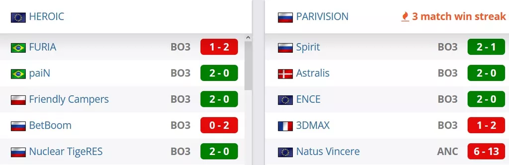HEROIC на сегодняшний день расположились на 20 позиции рейтинга от портала HLTV. PARIVISION на сегодняшний день занимают 2 позицию в России и идут на 17 строчке в рейтинге от портала HLTV.