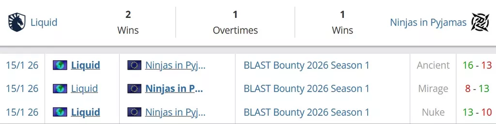 Один раз встречалист эти коллективы между собой неделю назад. Тогда со счетом 2-1 победили Liquid. Забрали парни пик соперника de_nuke со счетом 13-10, уступили на своем выборе de_mirage со счетом 8-13 и были сильнее на десайдере de_ancient со счетом 16-13.