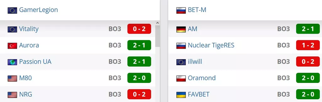 GamerLegion на сегодняшний день занимают 18 строчку в рейтинге от портала HLTV. BET-M на сегодняшний день идут на 16 строчке в России и занимают 103 позицию в мировом топе.