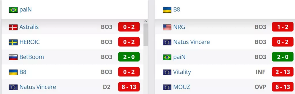 Одна победа в последних шести матчах у коллектива. На двух картах победили BetBoom. Со счетом 7-13 проиграли G2, со счетом 8-13 были слабее Natus Vincere, в нули уступили B8, Astralis и HEROIC.