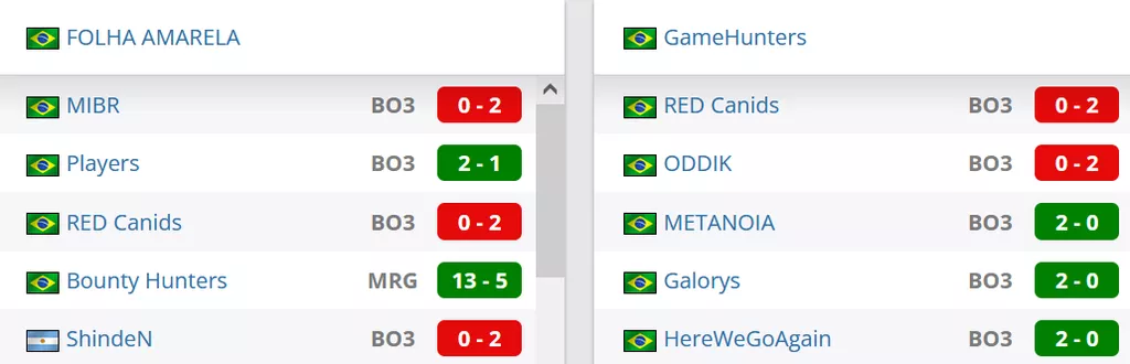 FOLHA AMARELA на данный момент идут на 21 строчке в Бразилии и занимают 188 позицию в мировом топе. GameHunters на сегодняшний день идут на 16 месте в Бразилии и занимают 129 строчку в рейтинге от портала HLTV.