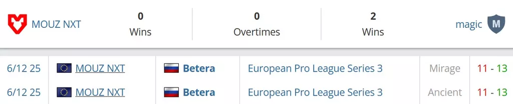 Две победы в последних пяти матчах у коллектива на данный момент. Со счетами 2-1 выиграли у MASONIC и MOUZ NXT. Со счетом 1-2 уступили FORZE Reload, на двух картах проиграли BRUTE и Pigeons.
