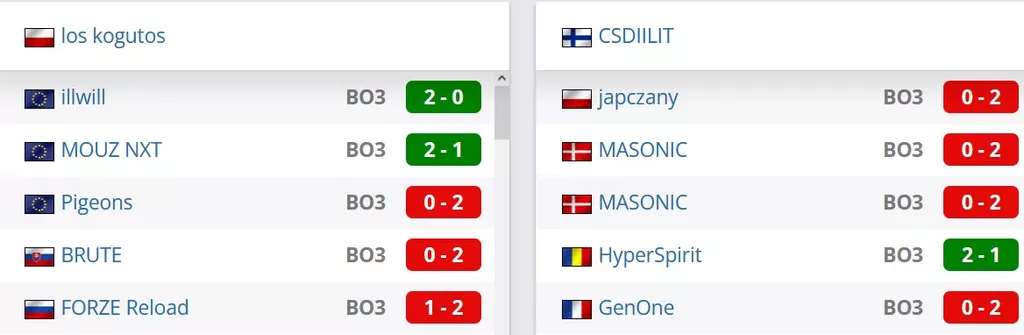 los kogutos на данный момент идут на 7 строчке в Польши и занимают 154 позицию мирового Табеля о Рангах. illwill на данный момент квалифицировались на 63 место рейтинга от портала HLTV.