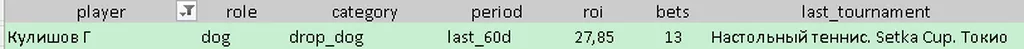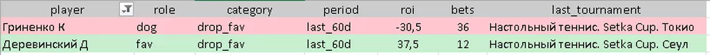 Сетка кап. Перетятько Андрей -Кулишов Григорий. Рейтинг Перетятько на Сетке 23,4. Рейтинг Кулишова 30,4. В рейтингах ФНТУ примерно такая же разница. Но видно, что оба на Сетке не всегда играют с правильной мотивацией. Перетятько в последних двух турнирах проиграл все десять своих встреч. Кулишов выиграл половину своих встреч. По личным встречам десяти последним 8-2 в пользу Кулишова. Последнюю выиграл он же 3-2. Но он почему-то андердог. Да ещё и букмекеры больше поверили в победу Григория. А по моим данным, это даёт выгоду при ставках на него на дистанции. Но аккуратно возьмём два сета от Кулишова.