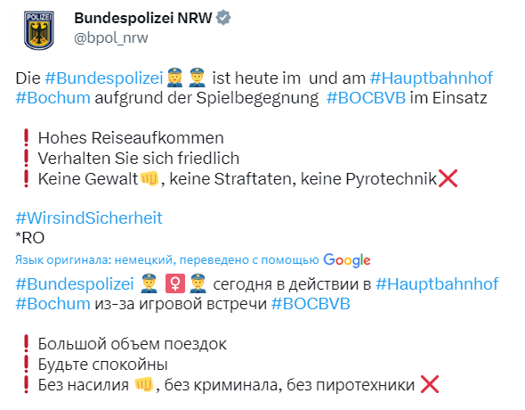твиттер полиции Бохума подтверждает, что они будут на игре)