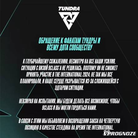 По сообщению от организации у 9Class возникли проблемы с получением визы. Из-за этого на The International 2024 за Tundra Esports в качестве замены выступит Мартин Saksa Саздов, Который все это время находился в запасе у организации.