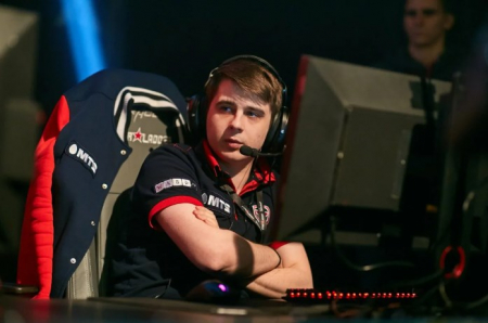 Fng играет с бело-красно-белым флагом Беларуси на стене во время турнира OMEGA League.