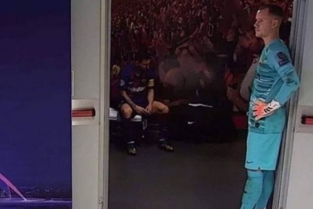 На фото изображен аргентинский нападающий «Барселоны» Лионель Месси, а также голкипер клуба Марк-Андре тер Штеген. Напомним, на перерыв клубы ушли при счете 4:1 в пользу мюнхенской «Баварии». Сама игра закончилась победой «Баварии» со счетом 8:2.