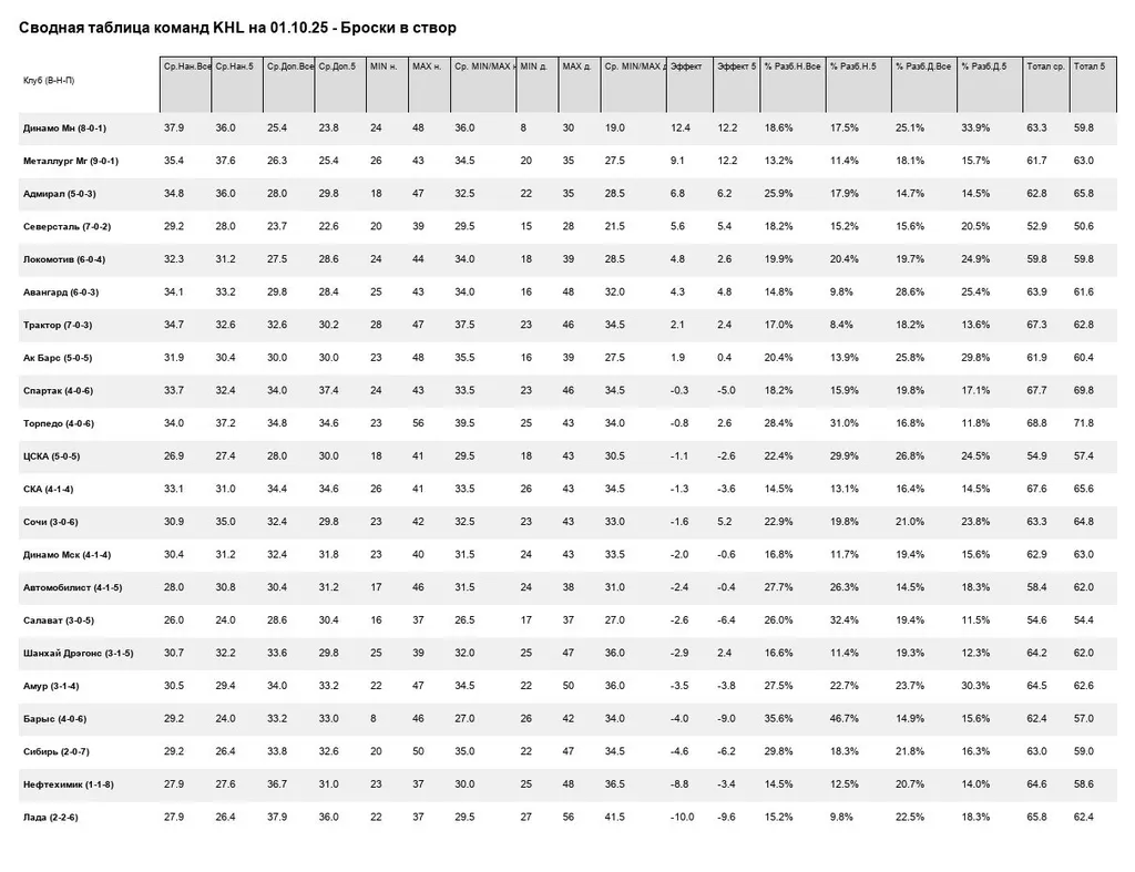 Глубокий анализ данных указывает на Салават как на фаворита по броскам. В среднем за матч обе команды наносят примерно одинаковое количество бросков, однако оборона Сибири очень часто позволяет сопернику выходить на оперативный простор, что создает пространство для бросков. В среднем по сезону Сибирь допускает по своим воротам 33.8 бросков. И всего в 2 из 9 матчей новосибирцы перебросали своего соперника.