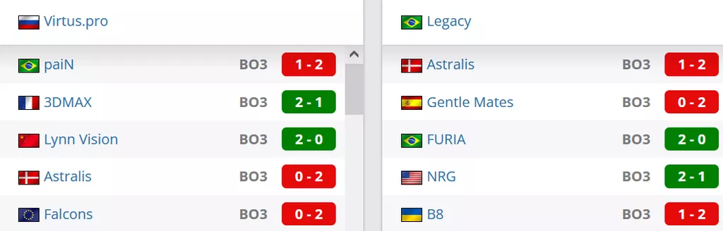 Две победы в последних пяти матчах у коллектива. Со счетом 2-1 победили NRG, на двух картах переиграли FURIA. Со счетами 0-2 проиграли Gentle Mates, Astralis, со счетом 1-2 уступили B8.