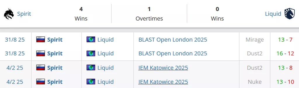 Два раза встречались эти коллективы между собой в этом году. Оба матча в свой актив записали Spirit. Все четыре карты забрали драконы. Последний раз команды играли между собой в конце августа, тогда на двух картах победили Spirit.
