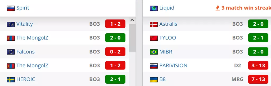 Spirit на сегодняшний день занимают 1 строчку в России и идут на 6 месте в рейтинге от портала HLTV. Liquid на сегодняшний день занимают 15 строчку рейтинга от портала HLTV.
