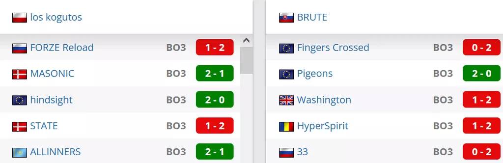 los kogutos на данный момент идут на 7 строчке в Польши и занимают 155 позицию мирового Табеля о Рангах. BRUTE на данный момент занимают 1 позицию в Словакии и идут на 187 месте в рейтинге от портала HLTV.