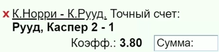 Особой уверенности в данном прогнозе нет, и наверное правильнее было бы рискнуть на точный счёт 2-1 в пользу Рууда за более интересный кэф.