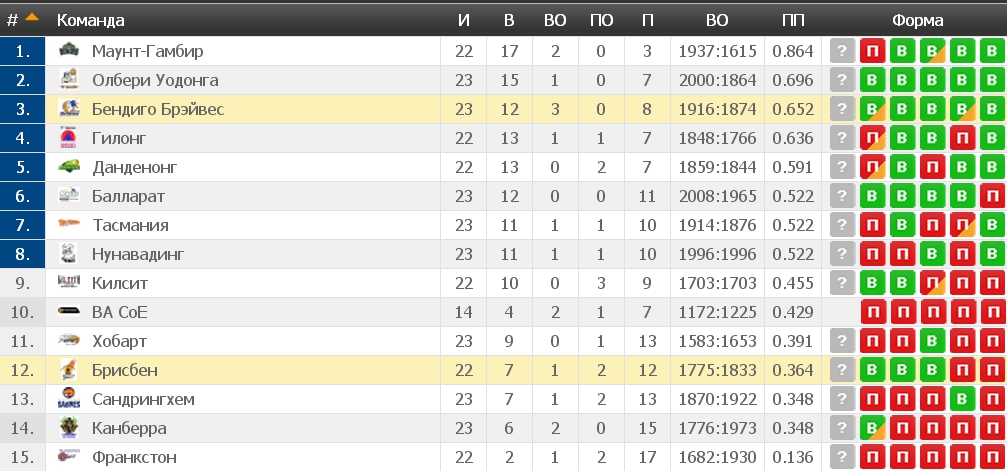 Ну и вот скрин результатов игр по турнирной таблице(вроде как положение на третьем месте обязывает Бендиго победить):